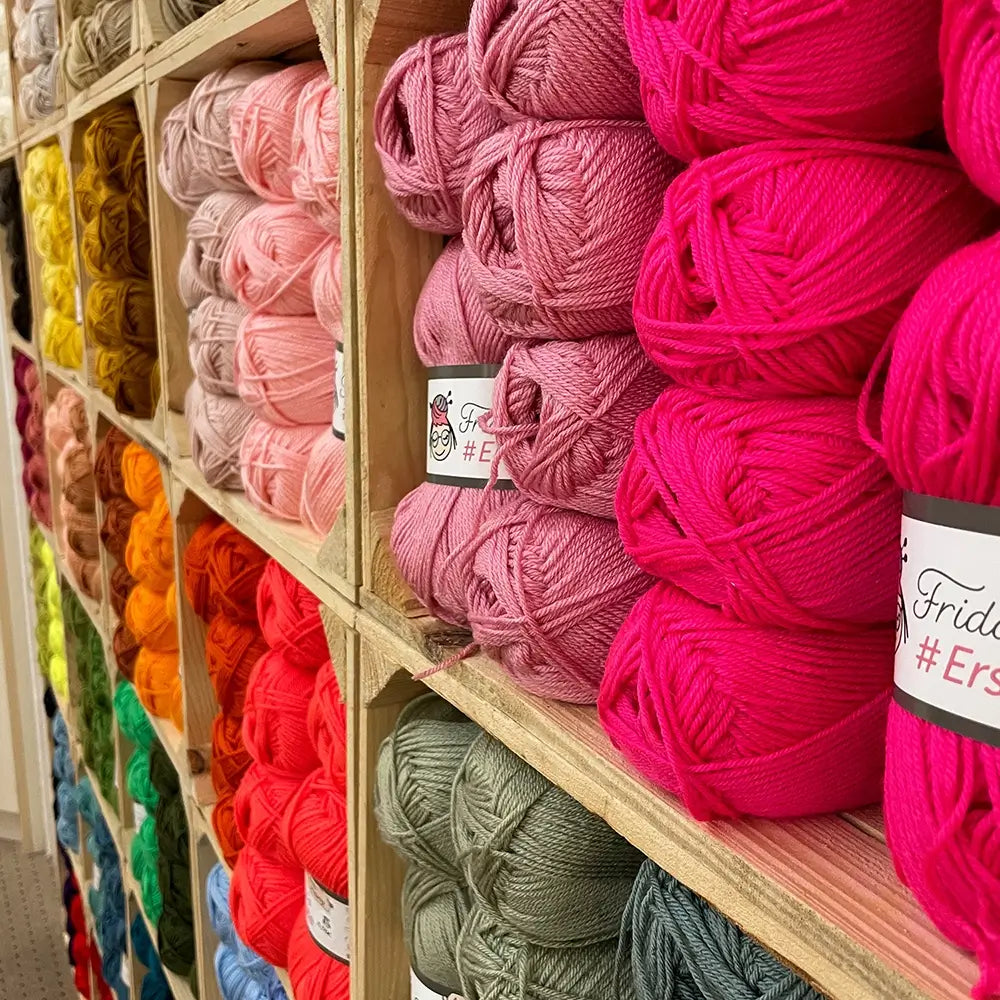 Über 50.000 Wollknäuel in vielen verschiedenen Qualitäten und unzähligen Farben von fast 40 namhaften Herstellern – inklusive unserer Eigenmarke – auf 400 m² Verkaufsfläche gibt es bei Frida's Wollhaus!